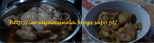 Limpe o excesso de gorduras do coelho. Não esqueça de retirar as glândulas de sebo, "o bedum", das patas traseiras (na parte de trás de cada uma das coxas, faça com uma pequena incisão e retire a bola de sebo que dá mau sabor à carne). Lave e coloque o coelho partido em pedaços num recipiente com água e rodelas de limão, durante meia hora. Num tacho, pique a cebola, deite o azeite e junte o louro, o colorau, o alho bem picadinho, o alecrim, o jindungo (pirpiri), o coelho partido em pedaços (escorra a água e rejeite as rodelas de limão), tempere com sal. Deite o vinho branco. Tape o tacho e leve a lume muito brando e deixe o coelho cozinhar lentamente no molho que se vai formando com o vapor da cozedura. Logo que esteja cozido, aumente a intensidade do lume e destape o tacho para deixar evaporar uma parte desse molho da cozedura e para que o coelho ganhe uma cor mais dourada.